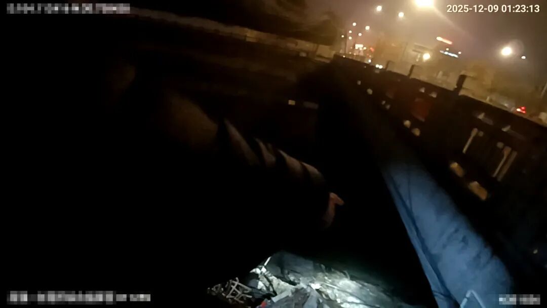 他心头一紧,快步上前,立即冲向河边护栏,借助手机微光,只见桥下漆黑的渠水中,两人正死死抓着渠壁外露的电缆挣扎着,冰冷湍急的水流不断冲击着他们的身体,随时可能将其卷入深水区。